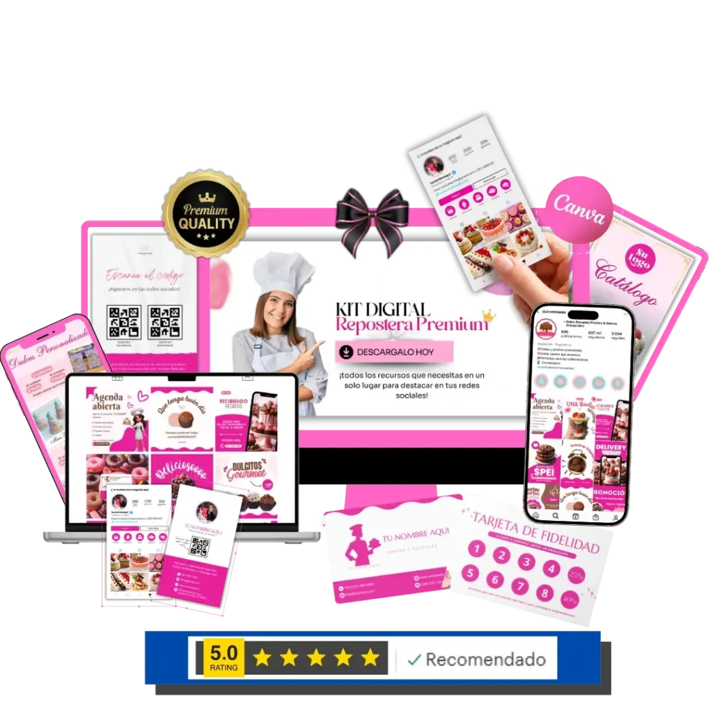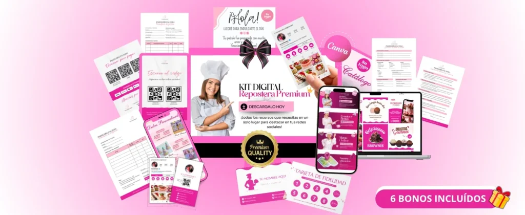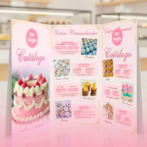 Catálogo Premium listo para usar: personalízalo con las fotos de tus productos, imprime o envíalo por WhatsApp, y presenta tu negocio como una repostera profesional.
